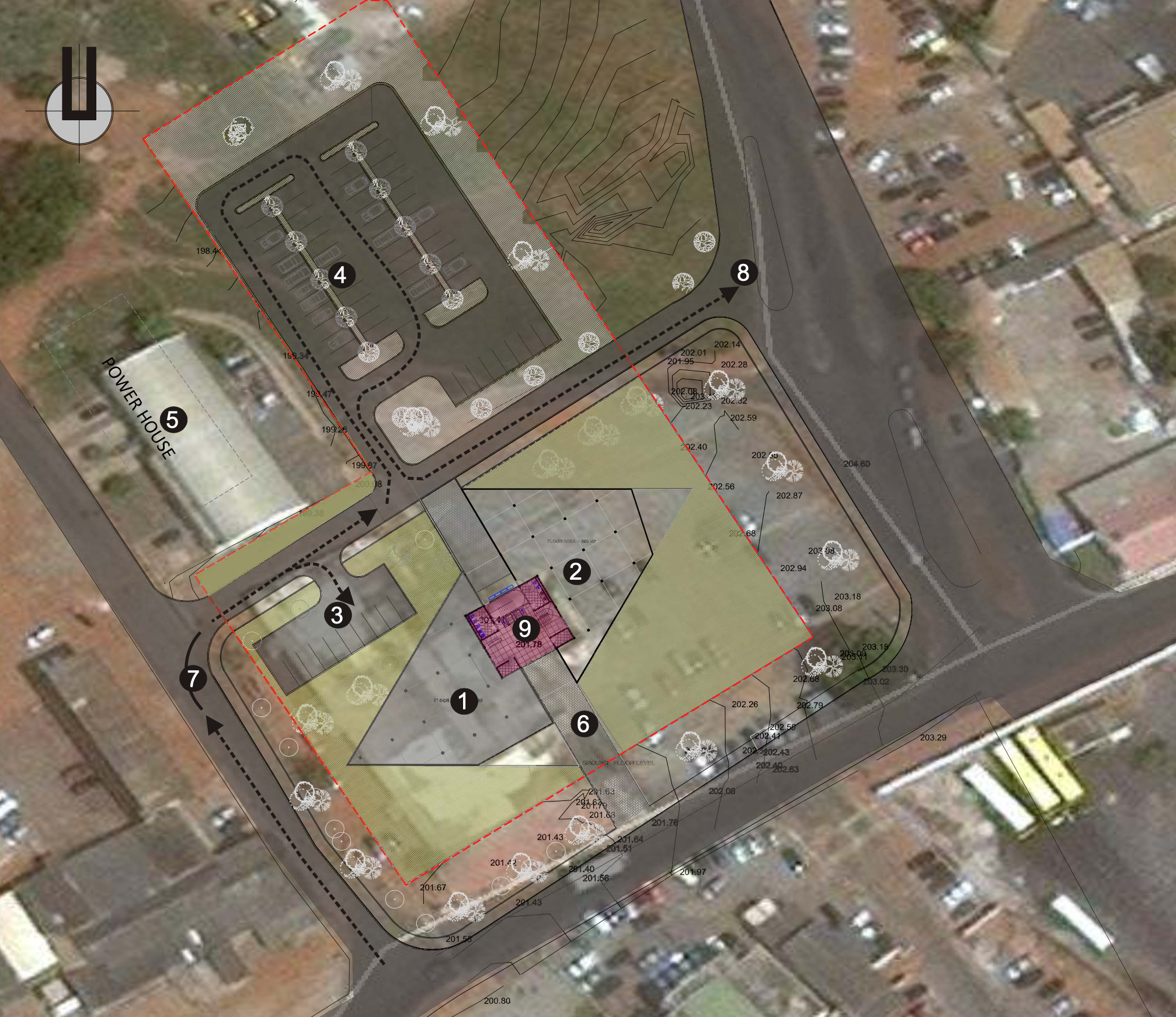The airport city enclave, close to the heart of Accra is now being celebrated for new high-rise modern buildings . The upspring of these new buildings points to the fact that the emerging Ghanaian economy can now afford more of such contemporary and architecturally striking buildings appearing on its landscape. In the mist of this new architectural discourse in this zone and attempt for a building to stand tall amongst the rest, the “kite” aims at stepping out of the struggle to establish clearly and proudly its place of architectural significance whilst addressing the programmatic needs of the client. Two triangles knitted together by a “red” square are the components of this play of geometry. The emphasis of choice of a central square prism is to act as a pivot of shared common space and facilities for the two volumes. These two triangular irregular prisms house the needs of the program efficiently and represent a period in time when the world has become a global village of which Ghana has an important role to play. DESIGN SOLUTIONS The design concept brings to play two triangular volumes are placed side by side to a vertical square prism. The two volumes are treated differently and creatively juxtaposed to bring interest to the “Kite”. By this composition, character and identity are given to the design. The conclusion is an elegant placement of two volumes with exoskeleton structural lines which allude to the imagery of flight. This outcome is affectionately referred by our team as the “Kite” The solution, integrating architecture and engineering inseparably, therefore involves an asymmetrical tower that addresses both skyline and street. Comprised of all vertical shafts, the connecting square tower emerges from the triangular prisms. The prism is clad in reflective glass that mirrors the changing sky, anchoring the expanding business district and providing a distinctive vertical axis to Accra’s skyline. The whole unit is supported by a simple post and slab system with an innovative exo-skeletal concrete frame that gives poetry to the composition. The principal design elements are glazing; curtain walling; and concrete bracing beams for the shell. The form is derived from simple geometric forms. The building avoids the strong glare of the west sun by the use of aluminum sun breakers to attenuate the effect of the same. Carefully selected double glazing configurations are additionally utilized to minimize solar transfer. PROJECT DETAILS Status ; Design Drawings Design Lead : Kofi Essel-Appiah Project Architect: Harry Asiedu