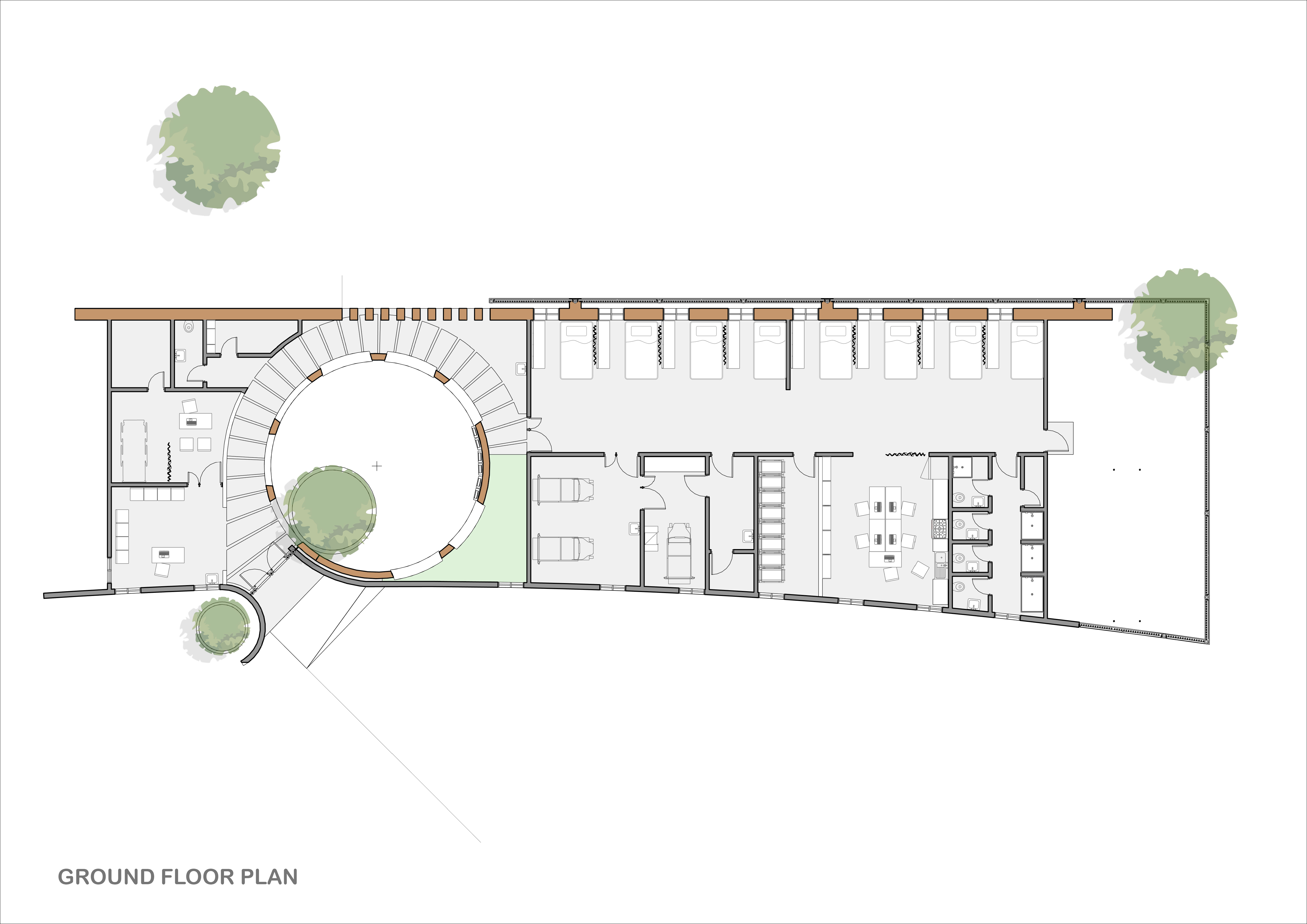 To the North wing of the central atrium lies the wards and the natal clinic for childbirth and surgery where applicable. This zone is clearly separate for medical operations and houses wards for women and spaces for the medical staff.