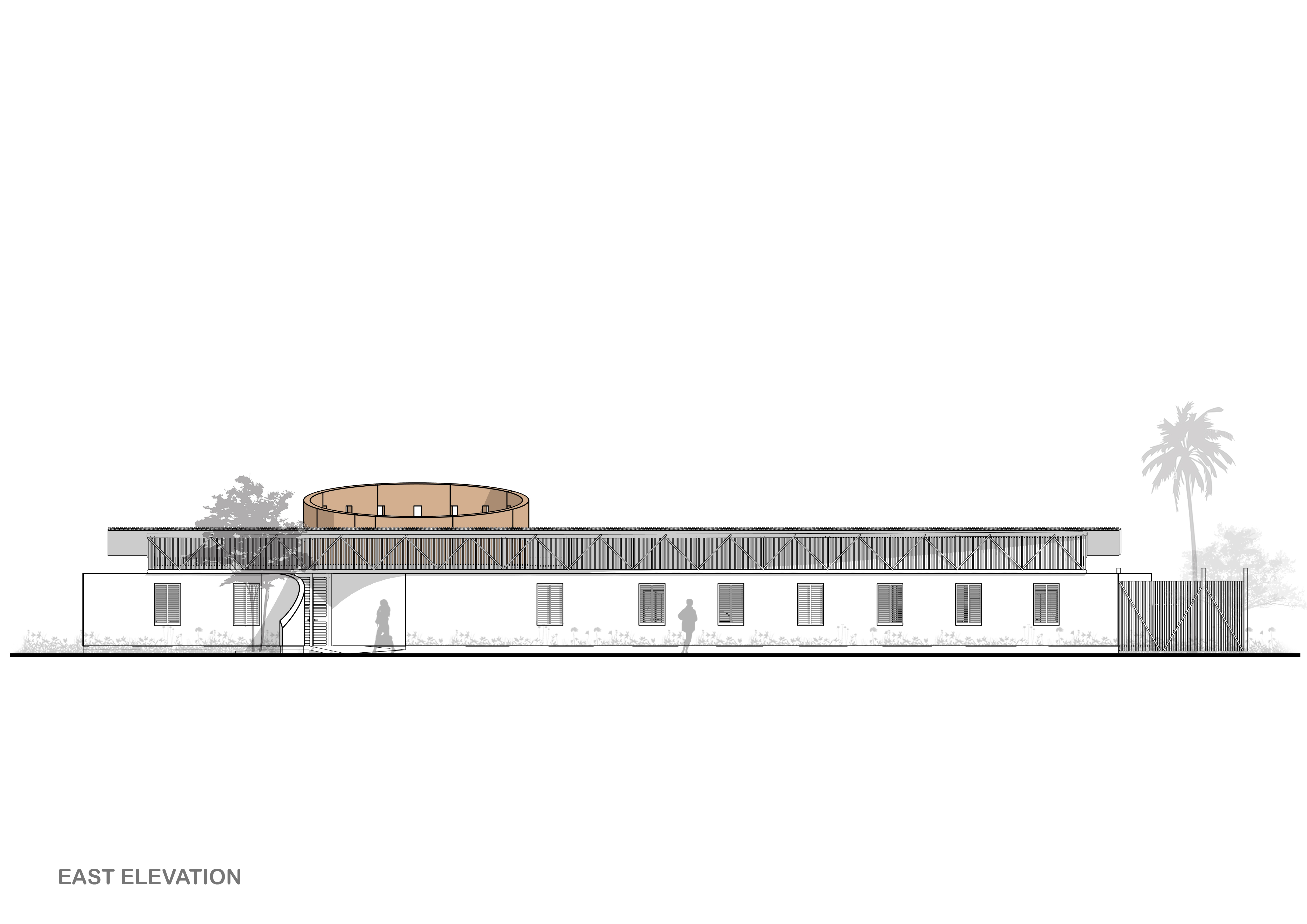 The exterior walls exist in 2 typologies- 400mm compressed earth walls and plastered cement block walls. The compressed earth walls will be formed using a mixture of soil, water, and a stabilizing agent, compacted into a dense and durable material.